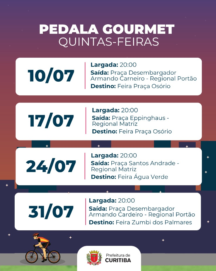 O Pedala Gourmet também tem como objetivo divulgar e valorizar as feiras livres da cidade, atraindo mais público e fortalecendo a economia local. A cada quinta-feira, a concentração será em uma praça diferente, com destino variado entre as feiras gastronômicas noturnas de Curitiba.